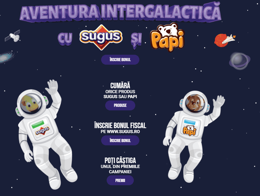 Cumpără orice produse Sugus sau Papi și înscrie bonul fiscal împreună cu datele personale în formularul de concurs de pe pagina campaniei promoționale Aventura intergalactică cu Gus și Papi.