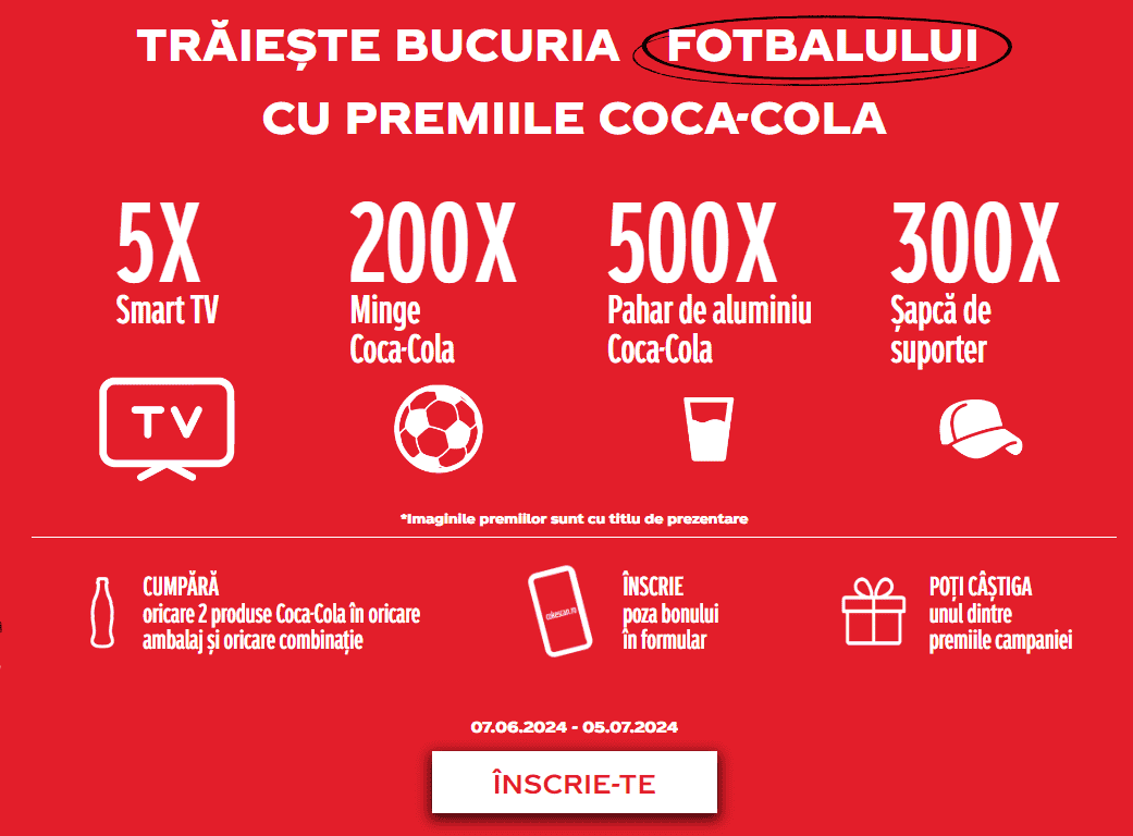 Câștigă unul dintre cele 5 televizoare LED Smart SAMSUNG 50CU8572 Ultra HD 4K HDR 125cm, una dintre cele 200 mingi de fotbal Coca-Cola, una dintre cele 300 șepci Coca-Cola sau unul dintre cele 500 pahare aluminiu Coca-Cola!