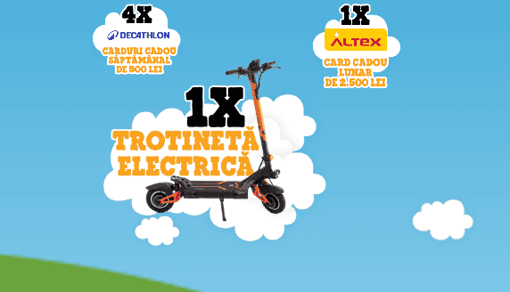 Poți câștiga prin tragere la sorți unul dintre cele 32 vouchere de cumpărături Decathlon în valoare de 500 de lei fiecare, unul dintre cele 2 vouchere de cumpărături Altex în valoare de 2.500 de lei fiecare sau o trotinetă electrică pliabilă KuKirin G3 Pro.