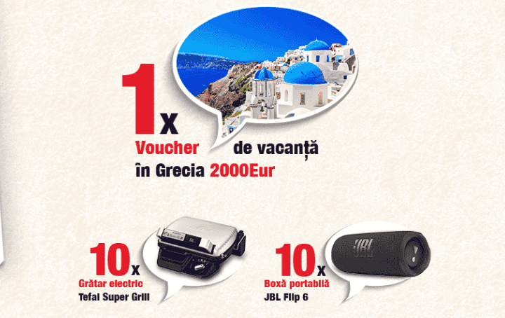 Poți câștiga prin tragere la sorți una dintre cele 10 boxe portabile JBL Flip 6, unul dintre cele 10 grătare electrice Tefal OptiGrill Elite GC750D30 sau un voucher de vacanță în valoare de 10.000 de lei pentru o vacanță de poveste în Grecia.