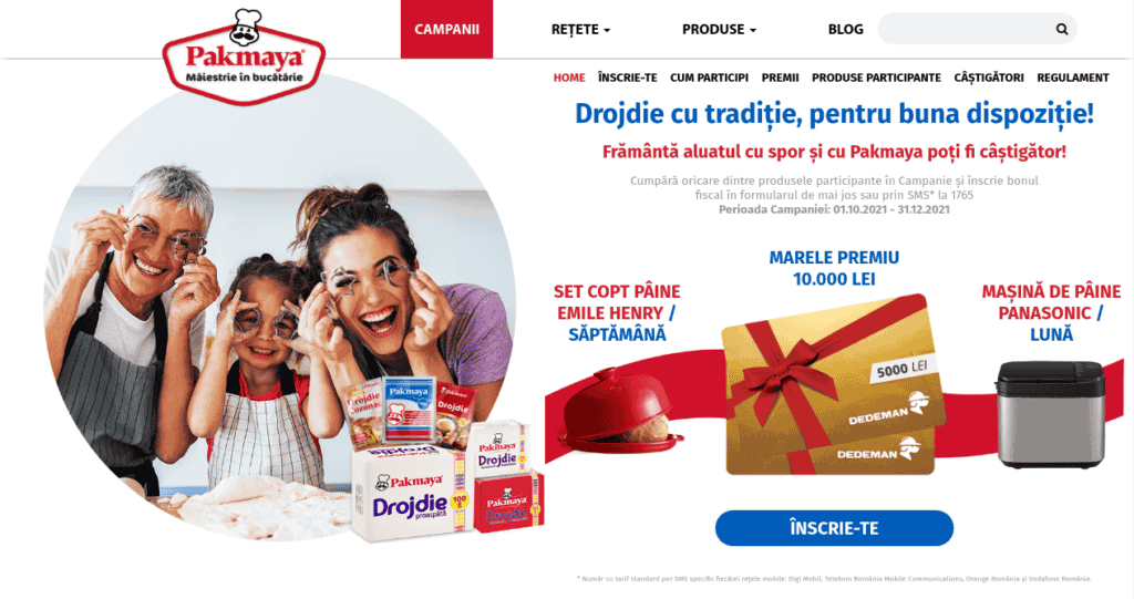Cumpără orice produse Pakmaya participante în campanie, înscrie bonul fiscal pe site-ul campaniei promoționale sau trimite-l prin SMS la numărul 1765 și poți câștiga un voucher Dedeman în valoare de 10.000 de lei, 3 mașini de pâine Panasonic și 13 seturi de copt pâine Emile Henry.