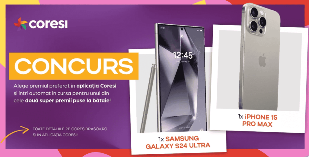 Descarcă aplicația Coresi din App Store sau Play Store, creează-ți un cont, dacă nu ai deja unul, accesează secțiunea dedicată concursului – Coresi Summer Party – apoi votează premiul pe care ți-ai dori să îl câștigi. După selectarea premiului din lista prestabilită, vei fi înscris automat în tombolă.