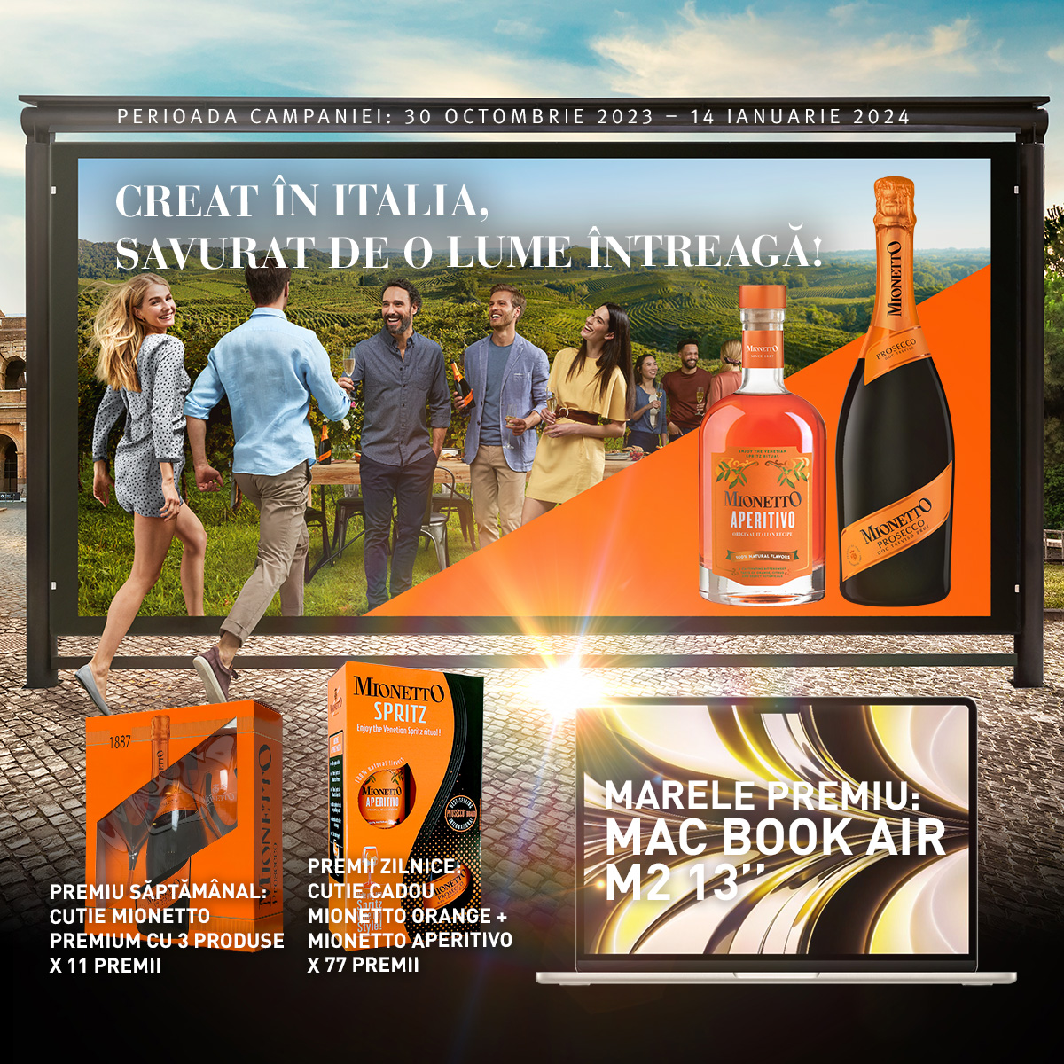 1 x laptop Apple MacBook Air 13, 77 x pachet alcatuit din Prosecco Mionetto DOC Treviso Brut + noul Mionetto Aperitivo, 11 x trei sticle din colecția speciala Edizione Festiva