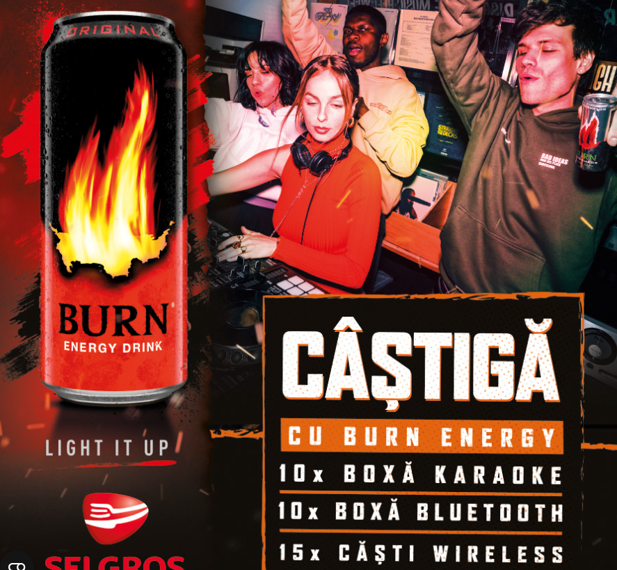 Ce trebuie sa faci?Achizitioneaza orice produs Burn din magazinele Selgros si inscrie bonul fiscal împreuna cu datele personale în formularul de concurs de pe burntepremiaza.ro.
