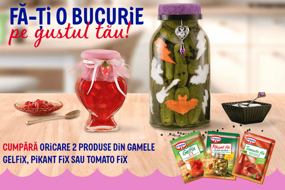 Achizitioneaza oricare 2 produse din gamele Gelfix, Pikant fix sau Tomato fix, înscrie numarul bonului fiscal împreuna cu datele personale pe site-ul www.oetker.ro, in sectiunea dedicata campaniei.