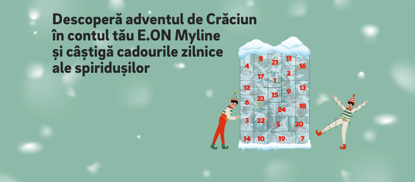 Ce trebuie sa faci?Intra în contul tau E.ON Myline, deschide Calendarul Advent, dezaburește fereastra zilei, descoperi sfatul spiridușului și ești înscris în cursa pentru darul zilei. (click aici daca nu ai cont).