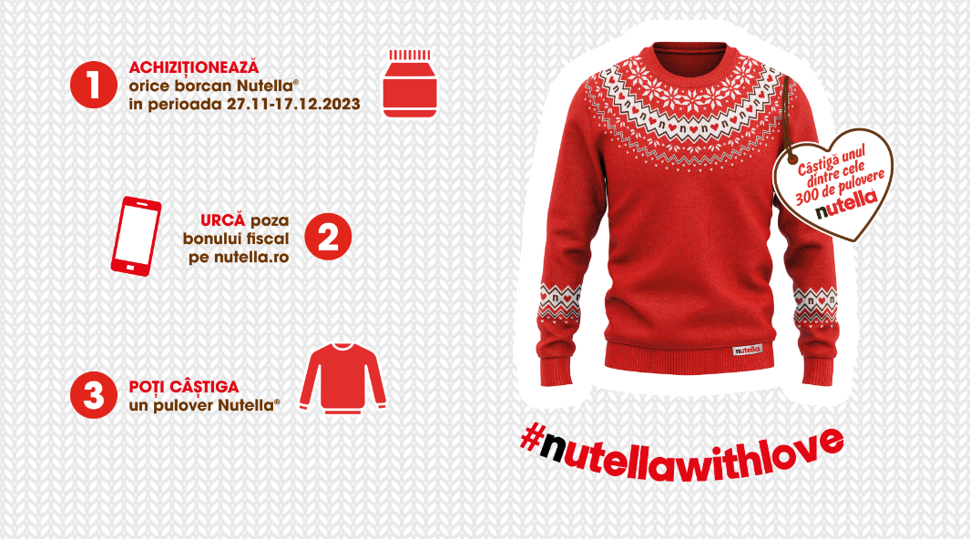 Achizitioneaza orice borcan Nutella (Nutella 30g, Nutella 200g, Nutella 400g, Nutella 600g, Nutella 700g, Nutella 825g sau Nutella 900g) si încarca poza bonului fiscal sau a facturii fiscale în formularul de pe nutella.com împreuna cu datele personale.