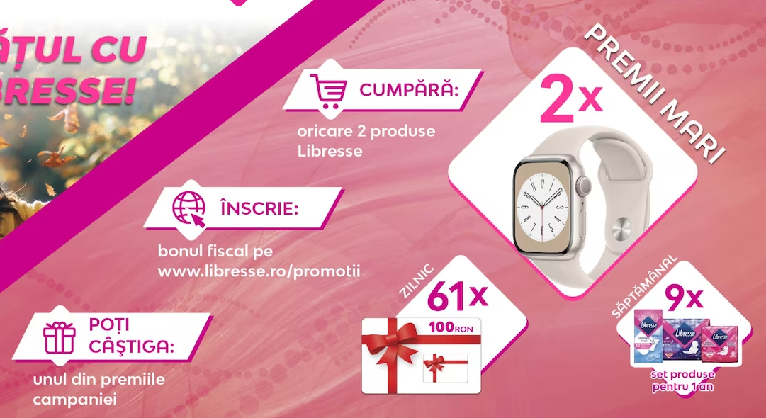2 x ceas smartwatch Apple Watch 8, 9 x set de produse Libresse pentru un an, 61 x voucher de cumparaturi Cobyul in valoare de 100 de lei