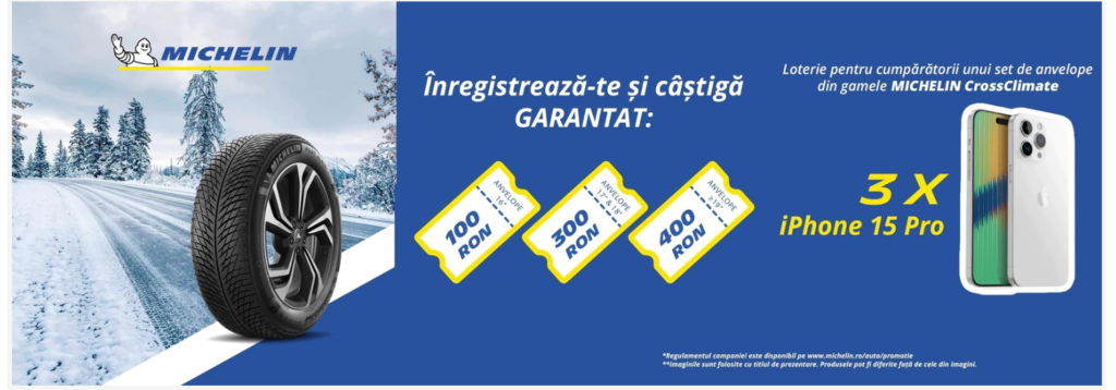 Achiziționeaza un set de 4 anvelope Michelin de iarna sau Michelin CrossClimate de la dealerii participanti la promotie (lista dealerilor o gasesti in regulament) + completeaza formularul de concurs cu datele tale de contact + detalii despre anvelope + numar & data bonului fiscal + nume & adresa distribuitor + incarca o poza a bonului/facturii fiscale.