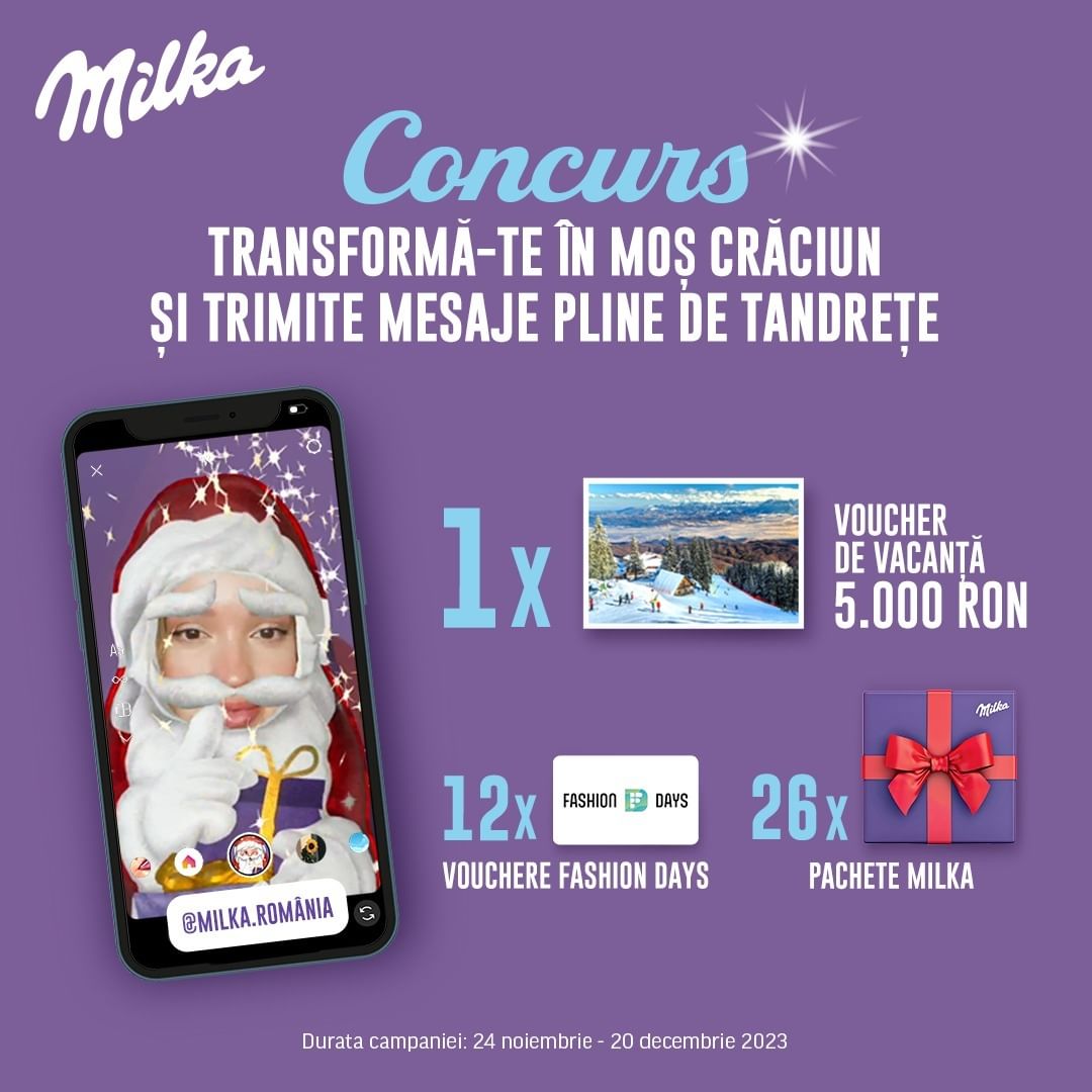 1 x vacanța de vis in Romania in valoare de 1.000 de euro, 12 x voucher de cumparaturi Fashion Days in valoare de 500 de lei, 26 x pachet cu produse Milka de sarbatori