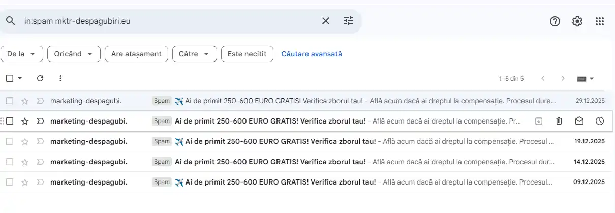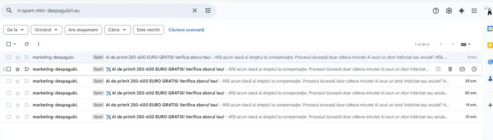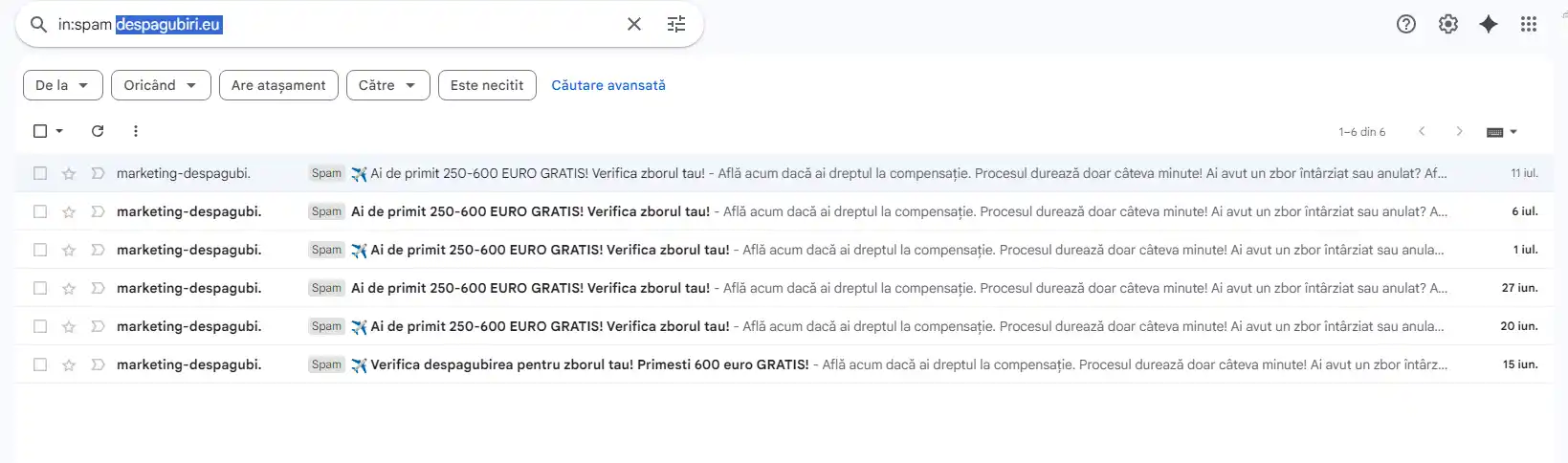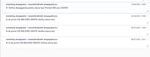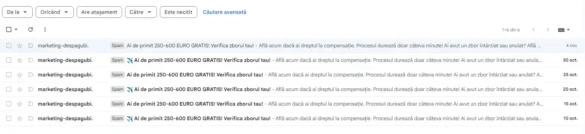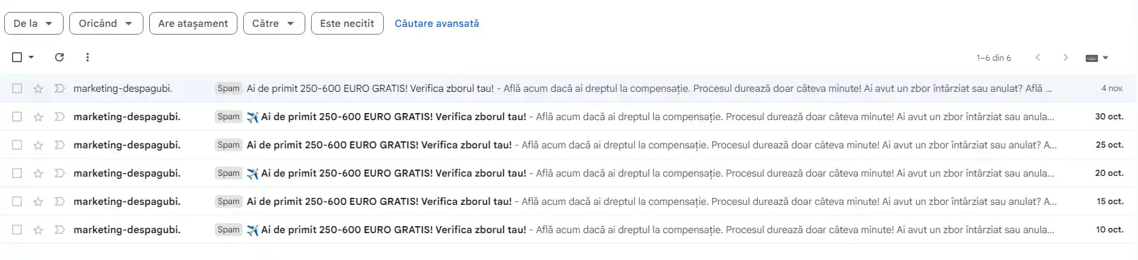 Am zburat 1 singura dată cu avionul cu compania WizzAir, adresă de email folosită la ei este una nume personal@gmail.com. Această adresă este folosită doar la instituții ale statului, companii aeriene, companii de utilități etc. Bănuiesc de unde au adresa de email (normal de la WizzAir). Problema este că nu pot scăpa de ei, am făcut sesizare la ANCOM și am primit răspuns că au baza de date interconectată cu companiile aeriene care operează pe teritoriul României și nu este nimic ilegal!