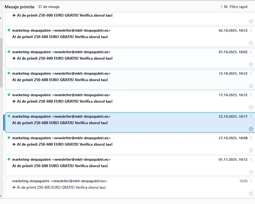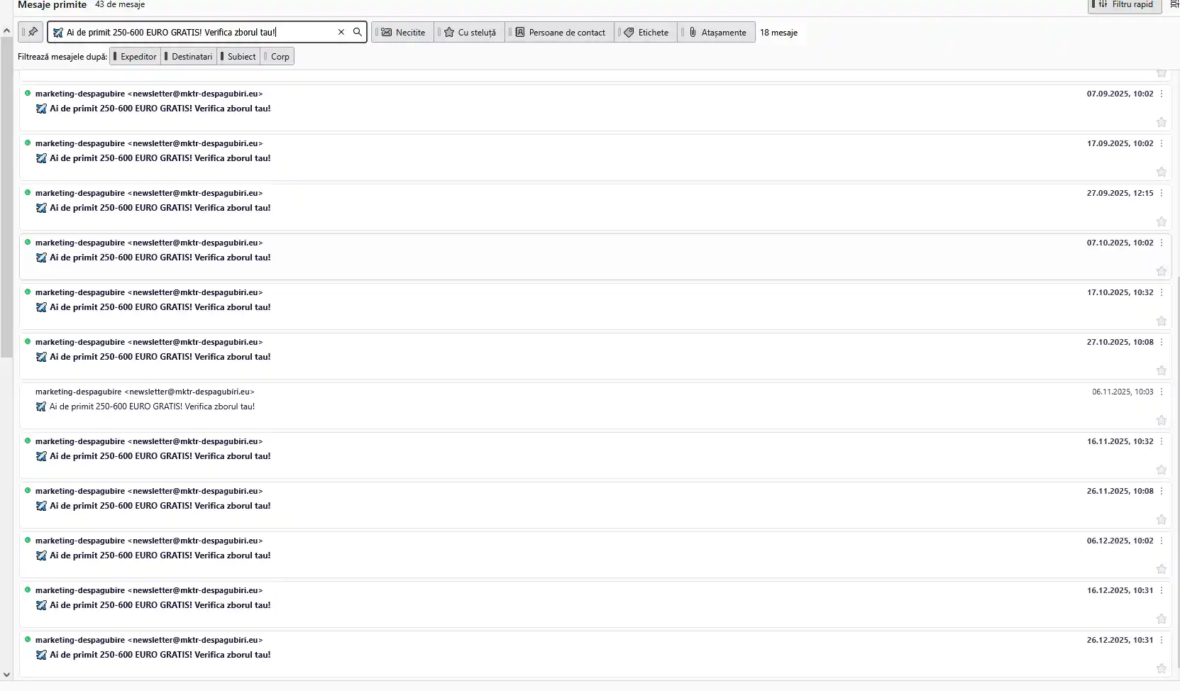 - Caracter repetitiv: Utilizatorul primește același mesaj de la același expeditor în mod repetat.