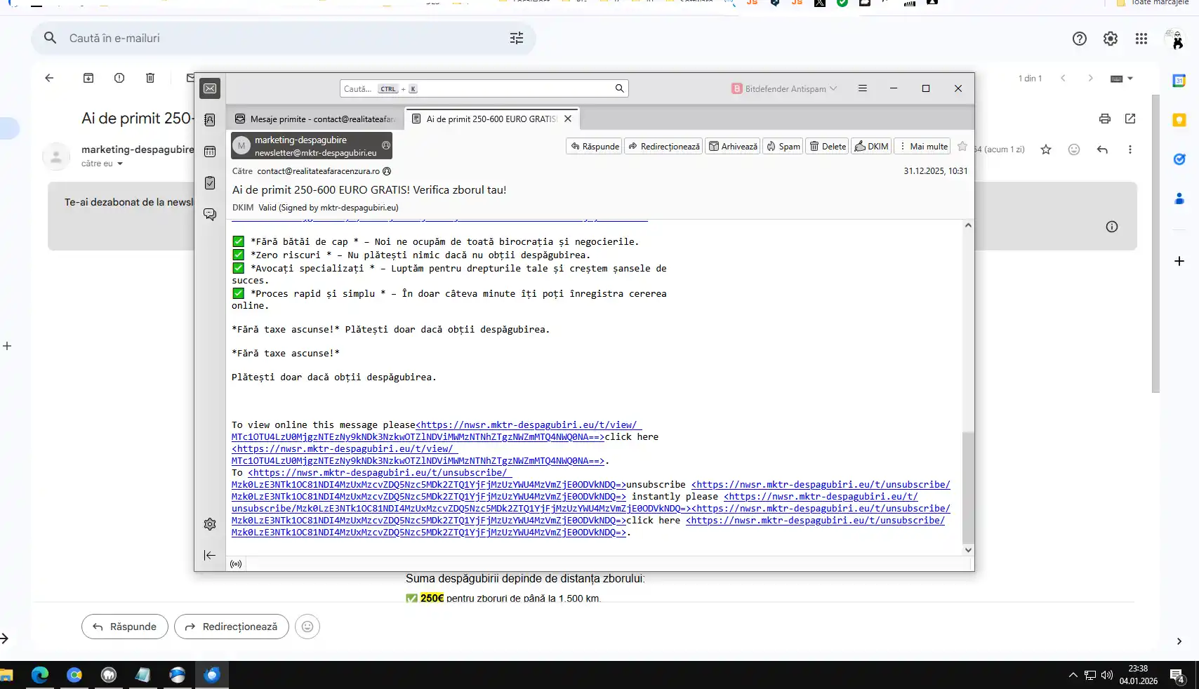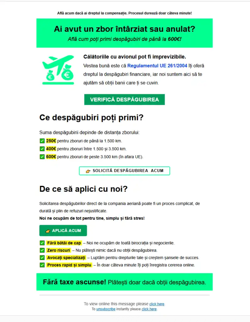 Content preview: Ai de primit 250-600 EURO GRATIS! Verifica zborul tau! AflÄ