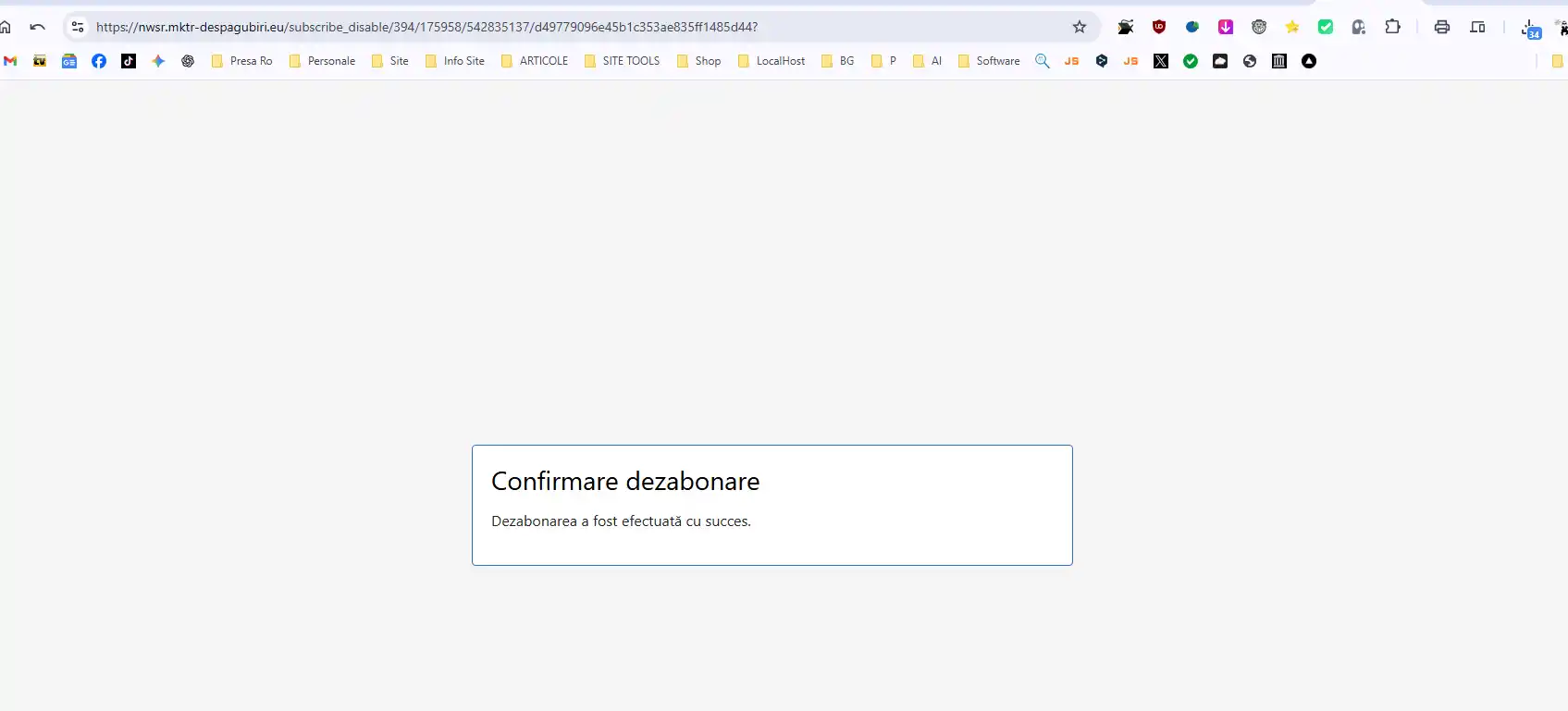 În data de 06.01.2026: am depus o sesizare la ANSPDCP, cu toate că firma este înregistrată în Bulgaria, am atașat dovezi video în care arătam dezabonarea, unde apărea că dezabonat, dar mesajele tot vin. Aștept răspunsul!