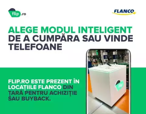 În magazinele Flanco din Craiova, Iași, Onești, Oradea și Petroșani, pe lângă serviciul de buy back deja disponibil, cei interesați de cumpărarea telefoanelor recondiționate o pot face la standurile special amenajate Flip.ro, cu ajutorul agenților de vânzări specializați.
