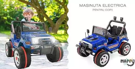 Masinuta electrica albastra Mappy Drifter Jeep cu 2 locuri pentru copii, ii va oferi copilului momente de neuitat alaturi de prietenii lui. E simplu, incarci bateriile, pui contactul, pornesti masinuta si distractia poate incepe. Viteza in linie dreapta, viraje, franari, manevre cu spatele, orice este posibil cu masinuta electrica Mappy. Orice ati face distractia este asigurata oricum. Daca cel mic nu se descurca inca “la volan”, dumneavoastra aveti posibilitatea sa controlati masinuta prin telecomanda inclusa.
