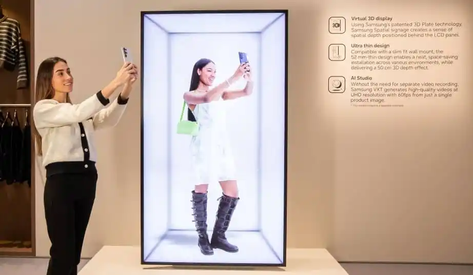 Spatial Signage este sistemul de afișare digitală 3D al Samsung, care oferă o experiență vizuală captivantă. Folosind tehnologia 3D Plate brevetată de Samsung, acesta creează o senzație de profunzime spațială poziționată în spatele panoului LCD. Conținutul păstrează claritatea imaginilor 2D, adăugând în același timp o adâncime 3D naturală, fără a fi nevoie de echipamente specializate, cum ar fi ochelarii 3D. Prezentarea afișajului atrage în mod natural atenția în mediile de retail, lux, muzee și divertisment, ajutând la concentrarea atenției asupra promoțiilor cheie, expozițiilor sau informațiilor importante.