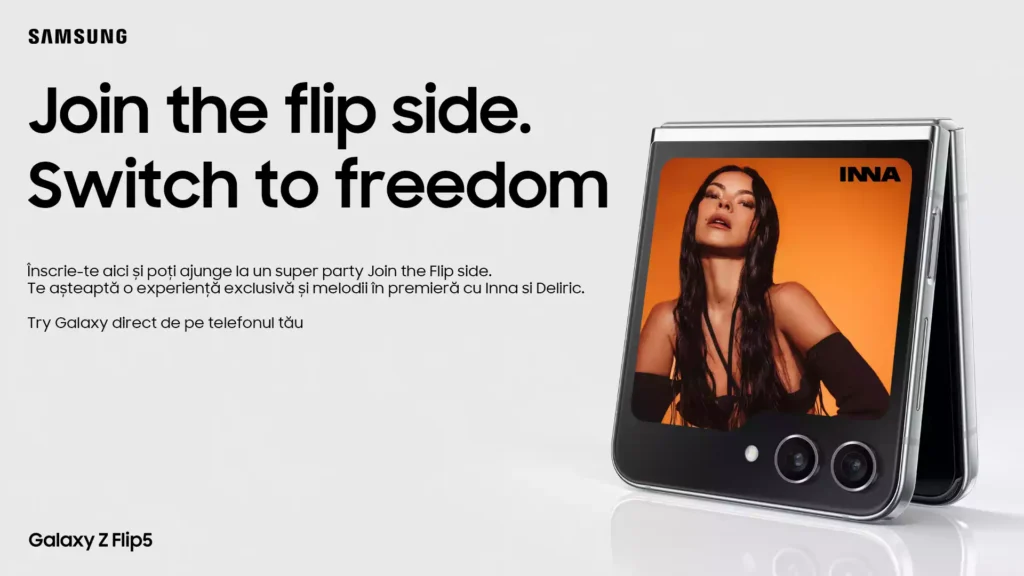 ,,Join The Flip Side. Switch to Freedom” îi va ajuta pe utilizatori să se familiarizeze cu procesul de trecere de la un telefon cu ecran static la unul cu ecran pliabil, dar și cu tranziția de la un sistem de operare închis la unul care oferă consumatorilor libertatea de a-și personaliza complet dispozitivul în funcție de propriile nevoi și preferințe. Pe parcursul a două luni, INNA și Deliric, alături de alți ambasadori Samsung, vor aduce în prim-plan experiențele personale cu Galaxy Z Flip5 și respectiv Galaxy Z Fold5.